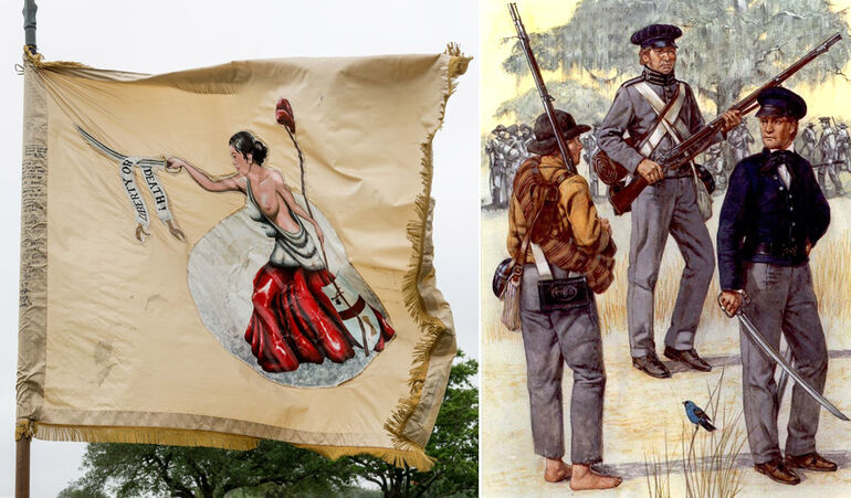 Знамя техасских повстанцев с надписью "Свобода или смерть" (современная копия) и сами повстанцы: Солдат 1-го пехотного полка майора Аллена, "ихтамнет" из 7-го пехотного полка армии США и майор Джон Аллен.
