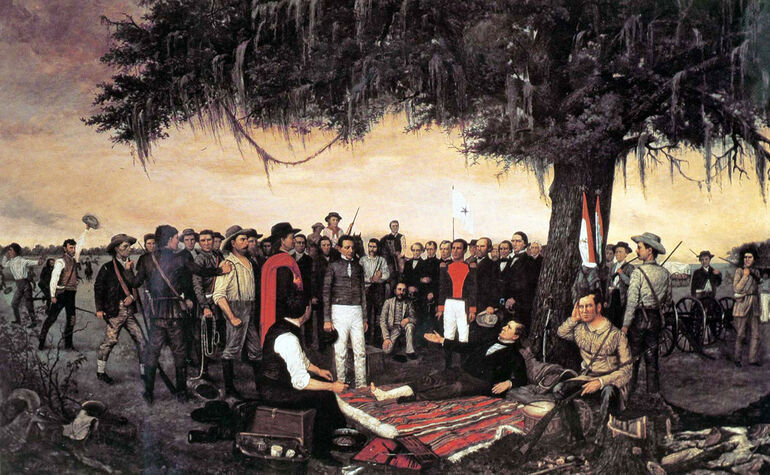 На заставке — битва при Сан-Хасинто на картине американского художника XIX века Хенри МакАрдла, которую можно разглядывать довольно долго. Изображен момент, когда техасцы врываются в мексиканский лагерь.