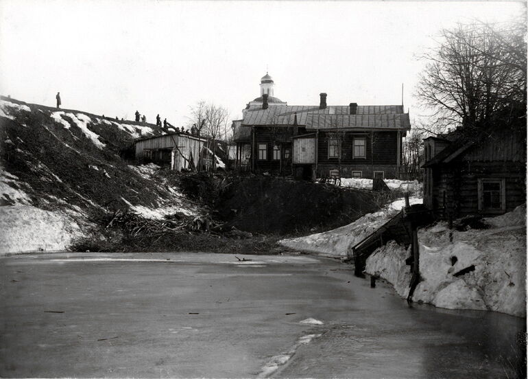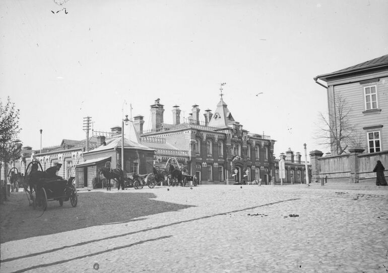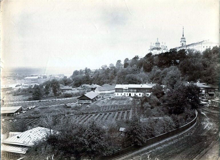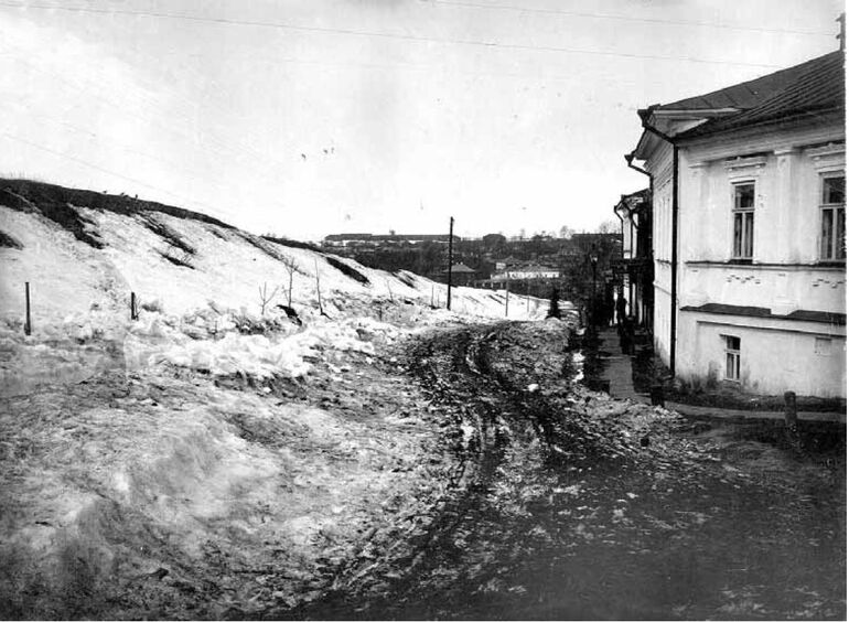 428. Улица Студеная гора. Справа, напротив училища угол двухэтажного деревянного Дома Благотворительного Общества за дощатым забором в столбах - ремесленно-грамотная школа