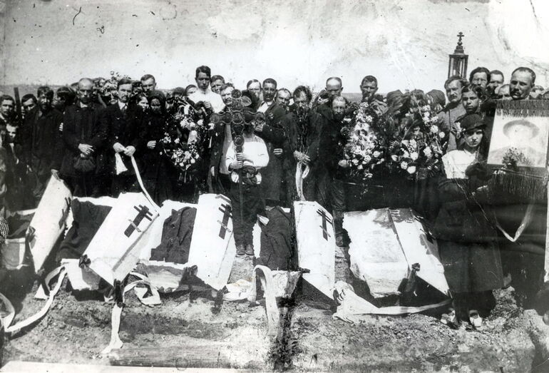 460. Останки казнённых революционеров, приготовленные для перезахоронения. 1917
