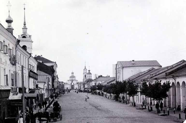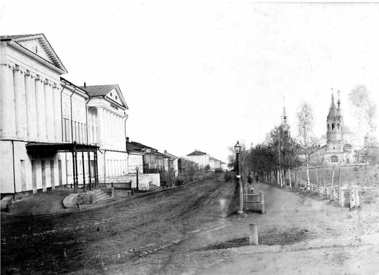 152. Большая Нижегородская улица. Слева здание Дворянского собрания с металлическим навесом на столбах и мужской гимназии с барьерами по бокам крыльца. 1876