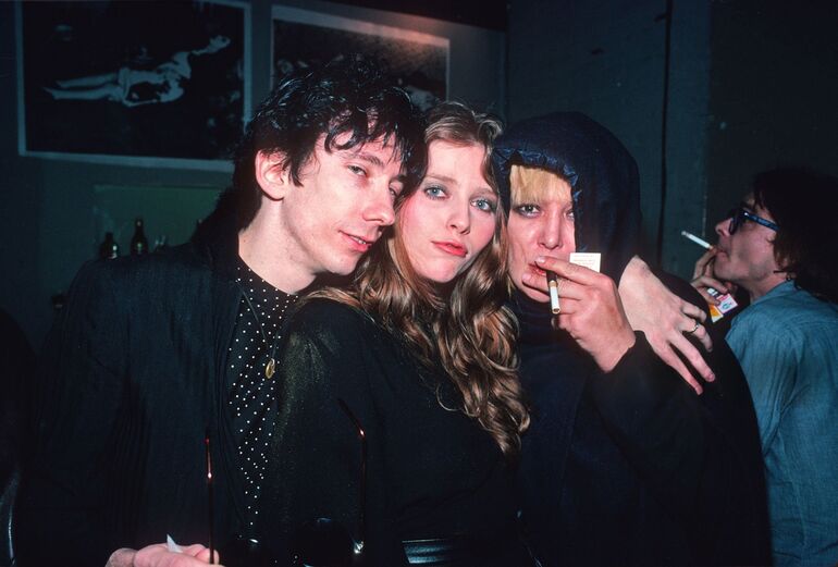 1980. Стив Баторс из группы Dead Boys позирует, обнимая моделей Бебе Бьюэлл и Аниту Палленберг, в клубе Mudd Club, Нью-Йорк, 1 января