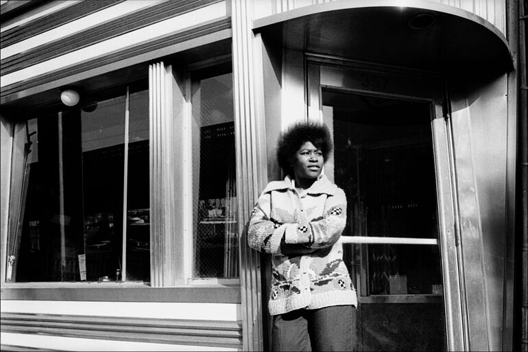 1981. Британская певица и гитарист Джоан Арматрейдинг позирует перед закусочной на Вест-стрит, Нью-Йорк, 1 марта