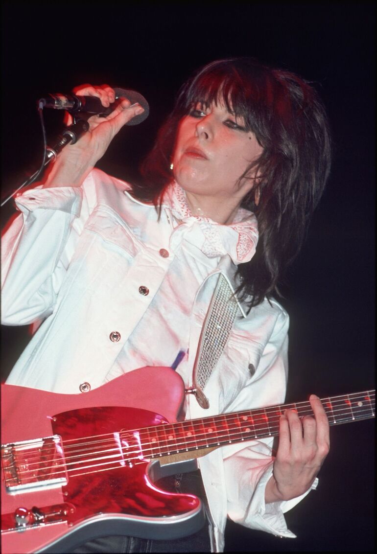 1980. Крисси Хайнд из группы The Pretenders играет на розовой гитаре Telecaster во время выступления в Palladium, Нью-Йорк, 3 мая.