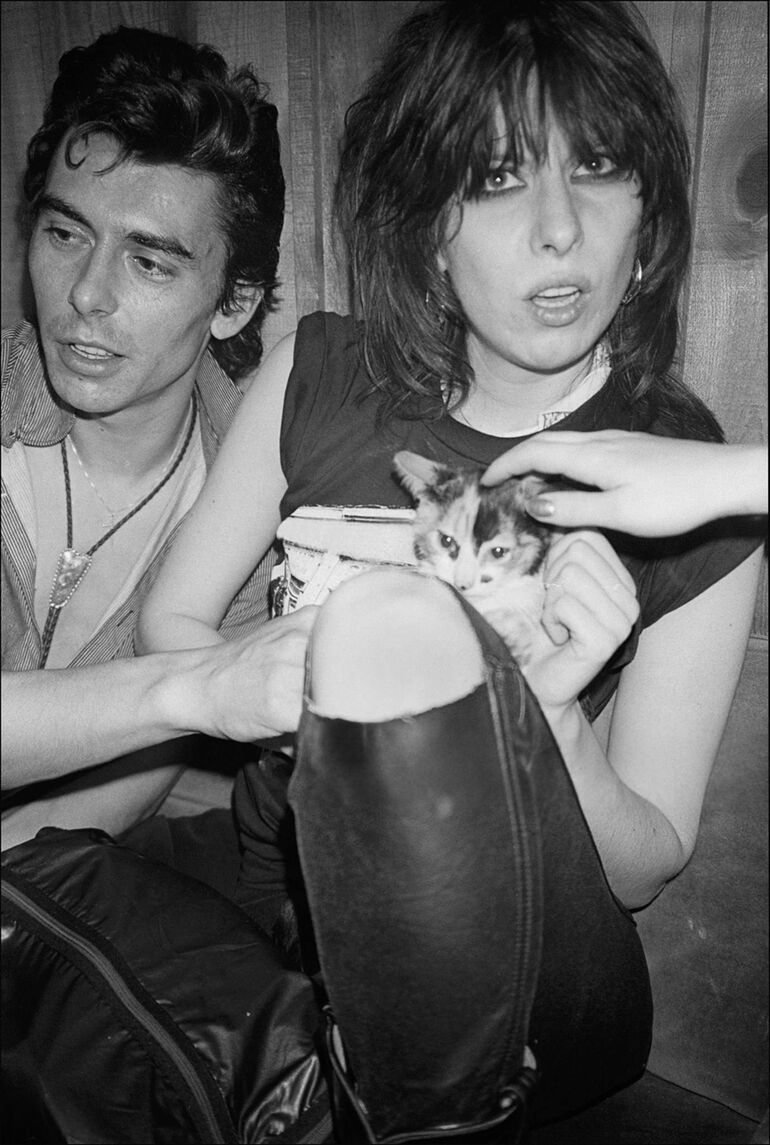 1980. Музыканты Пит Фарндон и Крисси Хайнд, оба из группы The Pretenders, позируют с котенком за кулисами театра Palladium после концерта, Нью-Йорк, 3 мая.