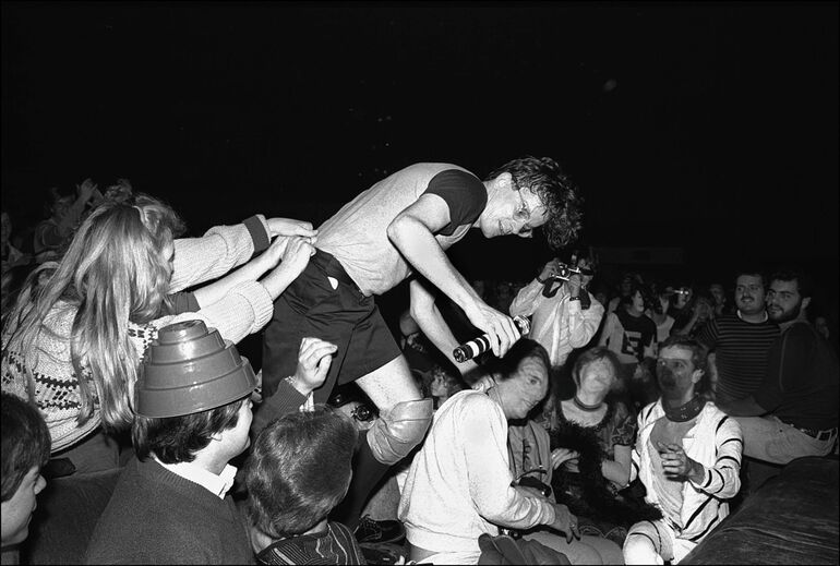 1981. Марк Мазерсбо из группы Devo забирается в толпу зрителей во время выступления в Radio City Music Hall, Нью-Йорк, 31 октября