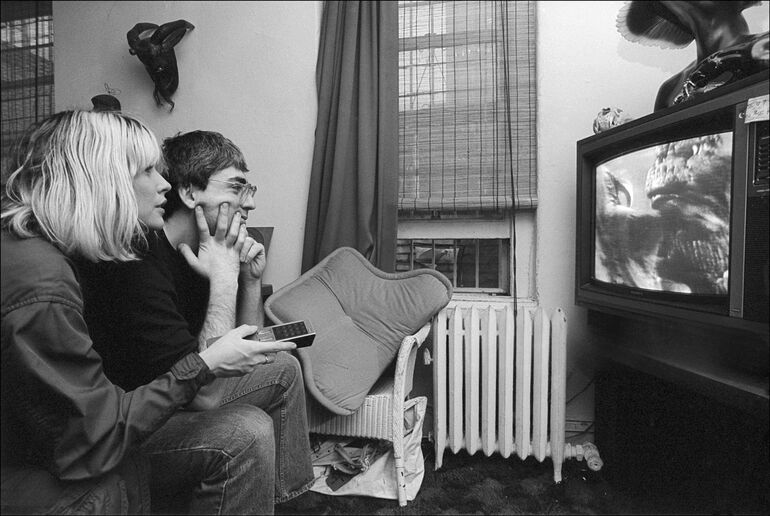 1980. Дебби Харри и Крис Стейн, оба из группы Blondie, смотрят фильм «Годзилла» по телевизору в своей квартире в Нью-Йорке, 28 ноября
