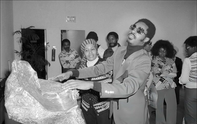 1976. В Музее-студии в Гарлеме слепой американский музыкант Стиви Уондер «видит» скульптуру руками. Нью-Йорк, 24 декабря