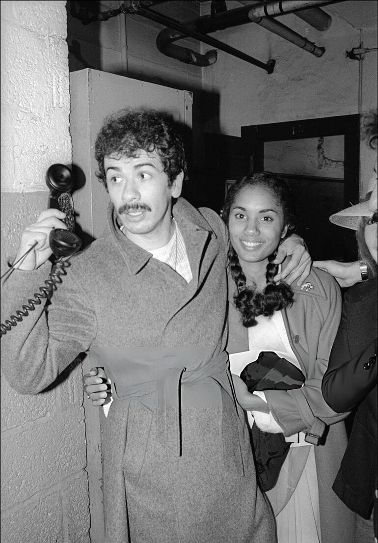1977. Карлос Сантана разговаривает по телефону за кулисами клуба Roseland после концерта, Нью-Йорк, 4 марта