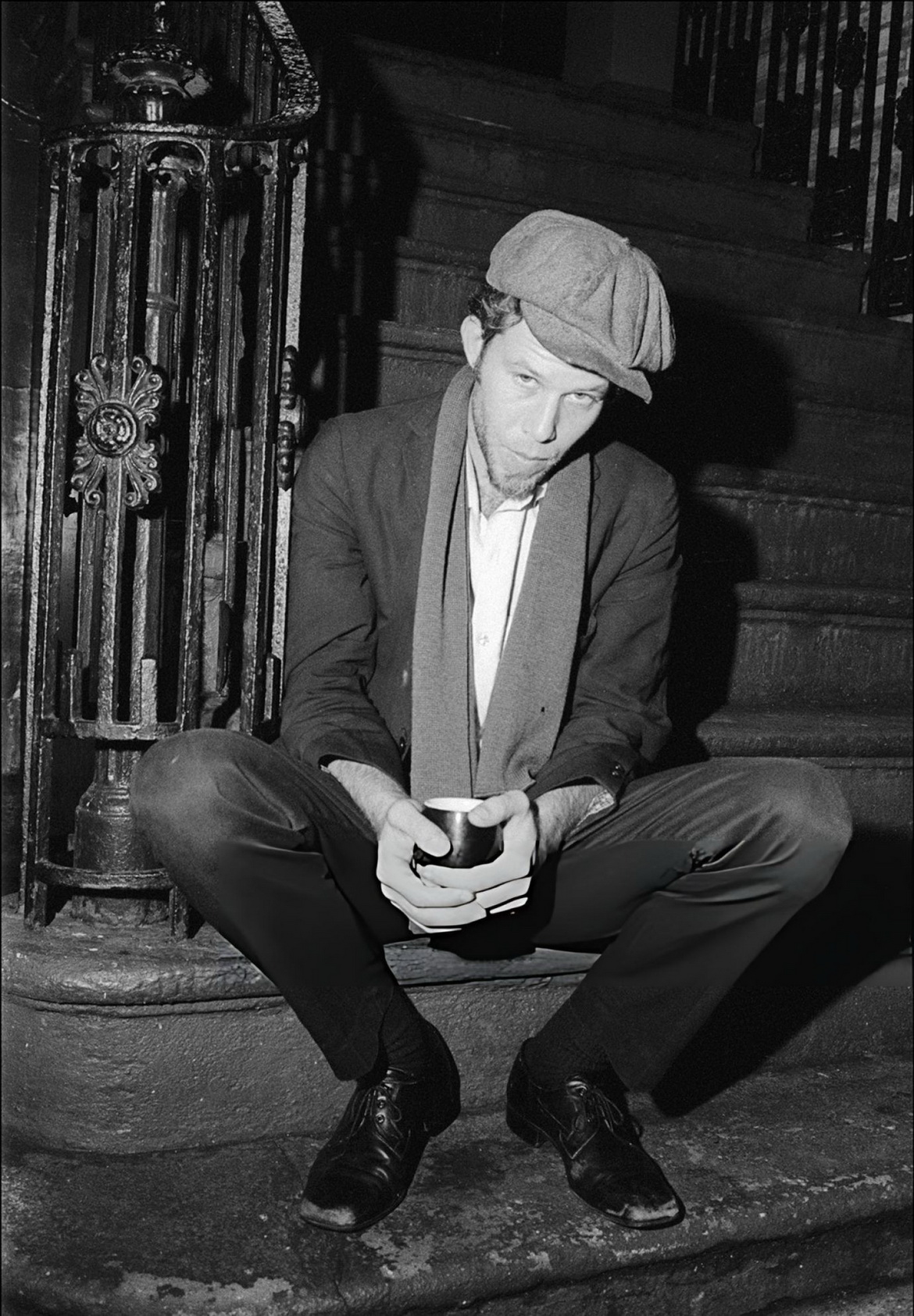 1975. Портрет американского музыканта и актера Тома Уэйтса, сидящего на ступеньках лестницы в Гринвич-Виллидж, Нью-Йорк, 22 сентября