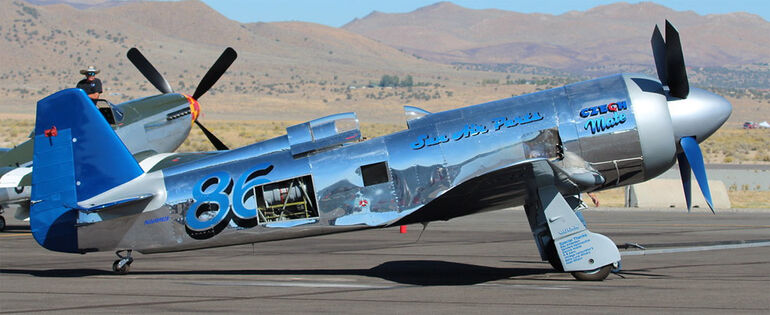Американская глубокая коныерсия Як-11, в которой с трудом можно опознать оригинал. САмолет, превращенный в одноместную гоночную машину, оснащен сверхмощным мотором в 2800 л.с.