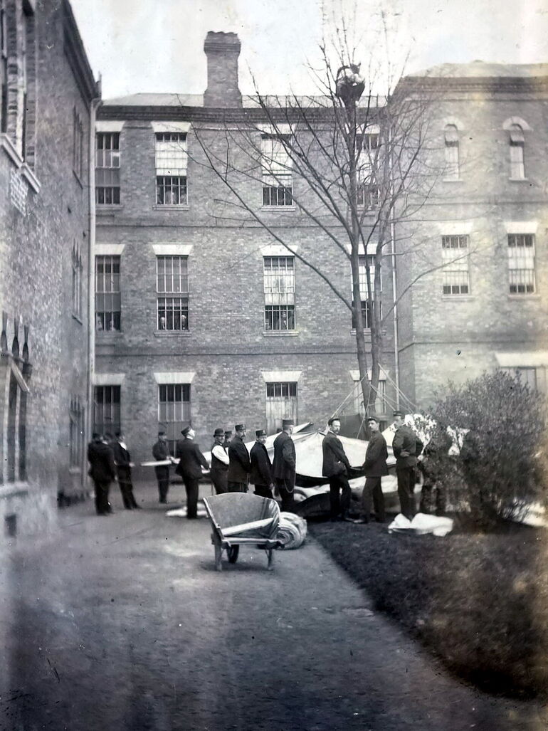 1895. Работники в приюте Колни-Хатч в Лондоне ждут, когда пациент спустится с дерева