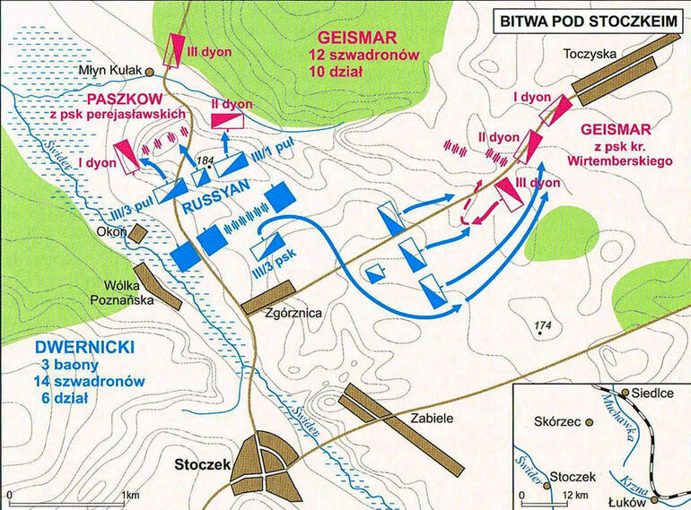 Российская дивизия, разгромленная у Сточека, состояла из Вюртембергского и Переяславского конно-егерских полков общей численностью 2100 человек, а командовал ею генерал с чисто русским именем и фамилией Фридрих Каспар фон Гейсмар. Впрочем, у нас его называли "Федором Клементьевичем". "Федор Клементьевич", как и положено германскому аристократу, относился к полякам с высокомерным презрением.